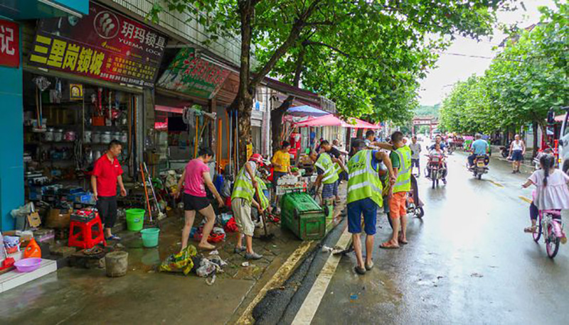 环卫车事业部安排后置滚扫吸尘车和人力,对水灾过后的路面淤泥进行快速清扫处理。